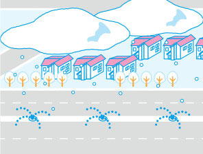道路に積もった雪を溶かすため、地下水をくみあげ散水する「消雪ポンプ」。必要以上にくみあげると地盤沈下の原因になりますが、当社の「えこぽん」は、雪の量に合わせて散水量を制御できるので、節約散水が可能です。